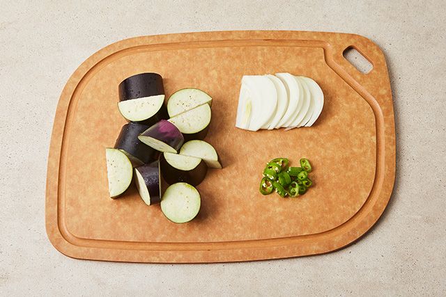 가지를 크게 등분하고 양파는 채 썰고 청양고추는 송송 썬다.