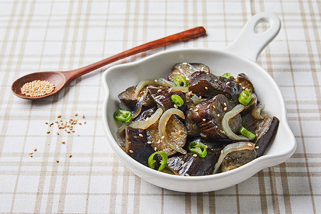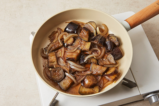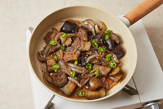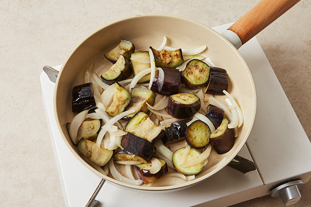 후라이팬에 카놀라유를 두르고 가지를 노릇하게 굽고 양파를 더해 볶는다.