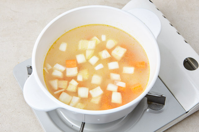 냄비에 올리브유를 두르고 감자, 당근, 양파를 볶다가 물을 부어 끓인다.