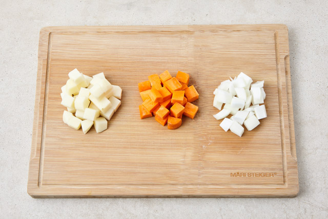 감자와 당근, 양파는 1cm로 깍둑 썬다.