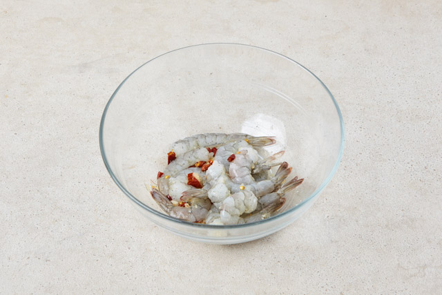 새우는 껍질과 내장을 제거하고 미향, 다진마늘, 소금, 후추, 부순 페퍼론치노로 간을 한다.