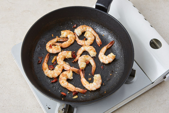 후라이팬에 약간의 올리브유를 두르고 새우를 굽는다.