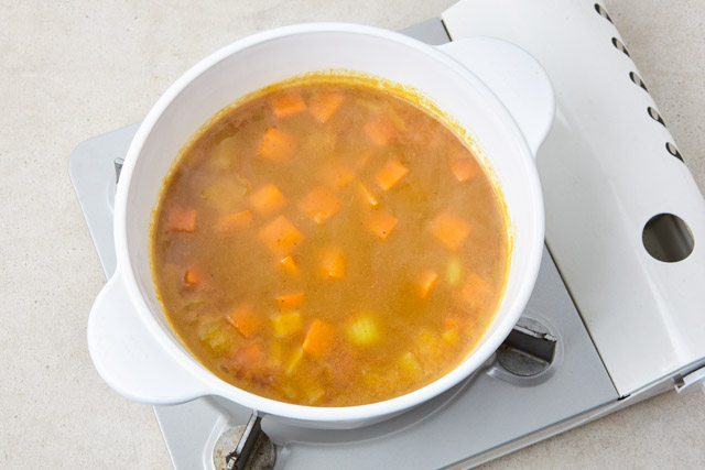 끓기 시작하면 카레가루와 스리라차를 넣고 5분간 끓여 카레소스를 만든다.