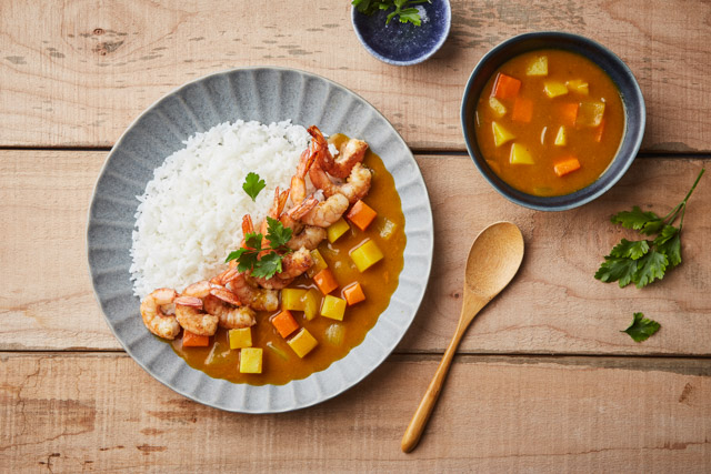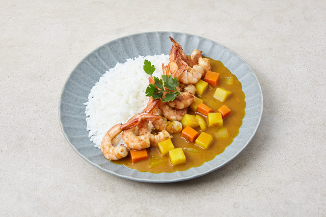 밥을 그릇에 담고 카레소스를 부은 뒤 구운 새우를 올려 완성한다.
