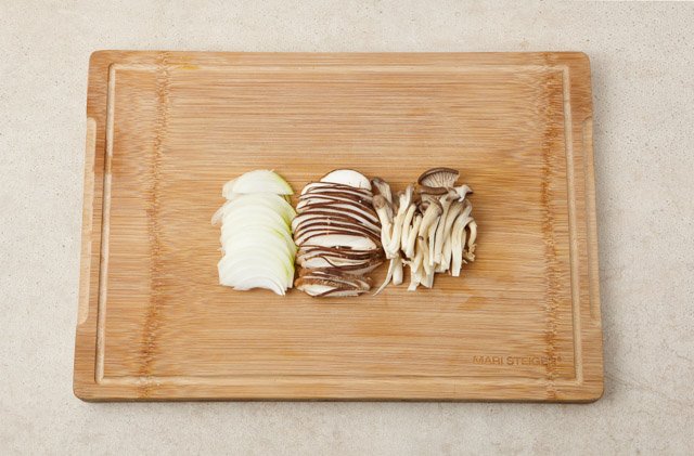 양파와 표고버섯은 얇게 채 썰고,느타리버섯은 뜨거운 물에 살짝 데친 후 잘게 찢는다.