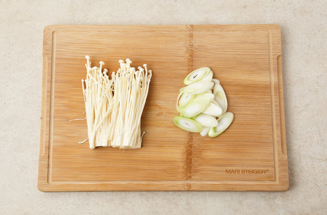 팽이버섯은 가로로 이등분하고, 대파는 어슷하게 썬다.