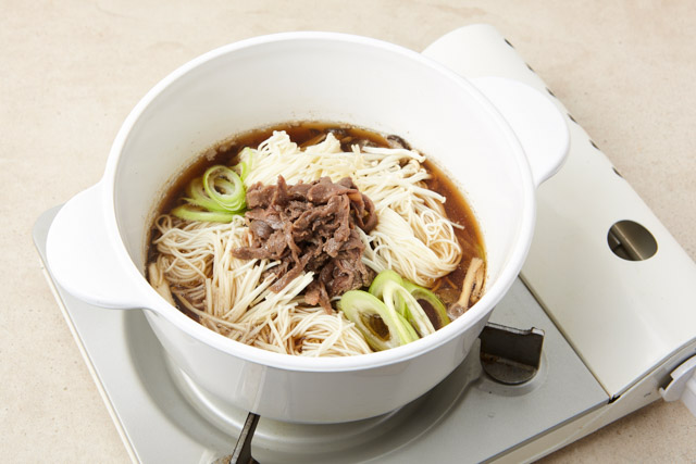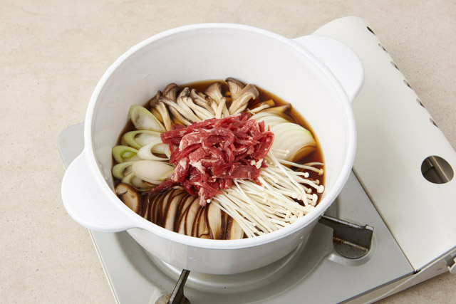 물과 장국을 냄비에 끓여 육수를 만들고,소고기, 양파, 표고버섯, 느타리버섯을 넣고 익힌다.
