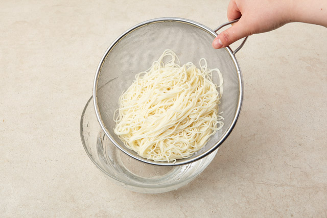 끓는 물에 면을 4분간 삶아 찬물에 헹궈 물기를 뺀다.