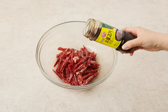 쇠고기는 얇게 채 썰고 소불고기 양념에 버무려 재운다.
