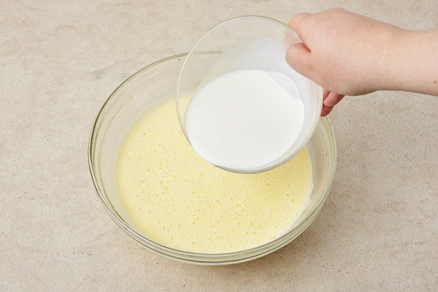 노른자와 설탕을 섞은 볼을 중탕하면서 우유를 조금씩 섞는다.