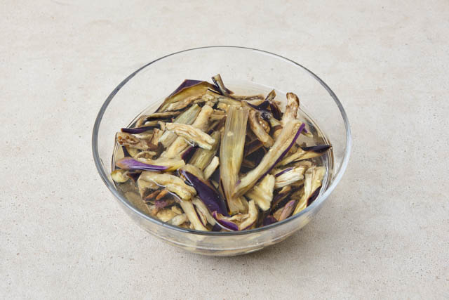 말린 가지를 뜨거운 물에 부드러워질 때까지 불린다. (약 10분)