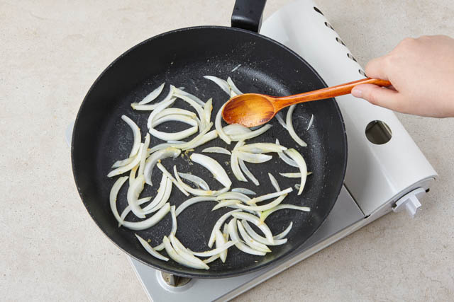 후라이팬에 참기름을 두르고 다진 마늘과 양파를 볶는다.