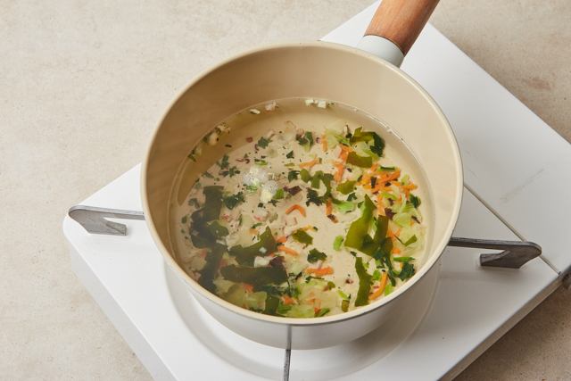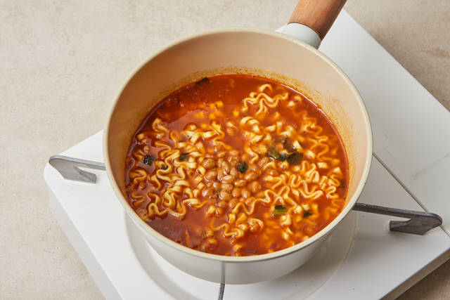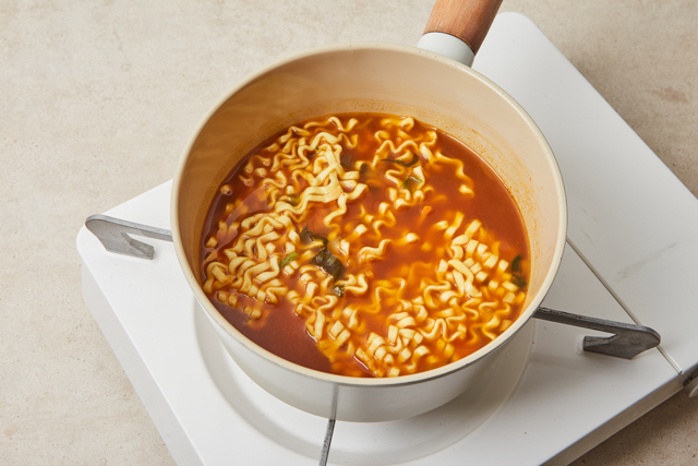 액상스프, 면을 넣고 5분간 더 끓인다.