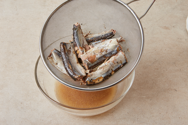 꽁치 통조림에서 꽁치만 건져내고 통조림 물을 버린다.