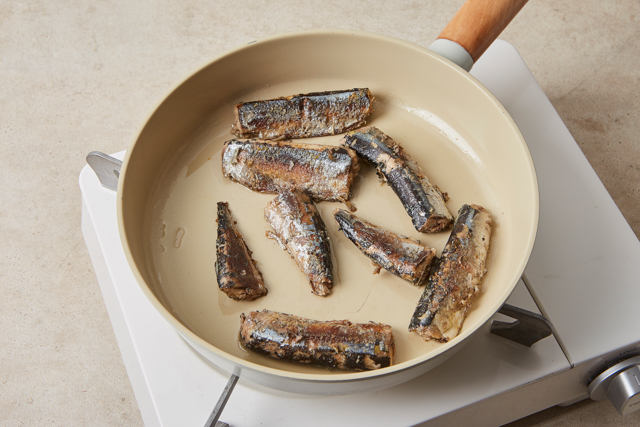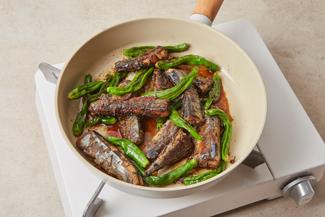 지글지글 소리가 나기 시작하면 만들어둔 소스와 꽈리고추를 넣고 꽁치를 뒤집어가면서 중 불에서 팬 바닥 면에 물기가 사라질 때까지 졸인다.