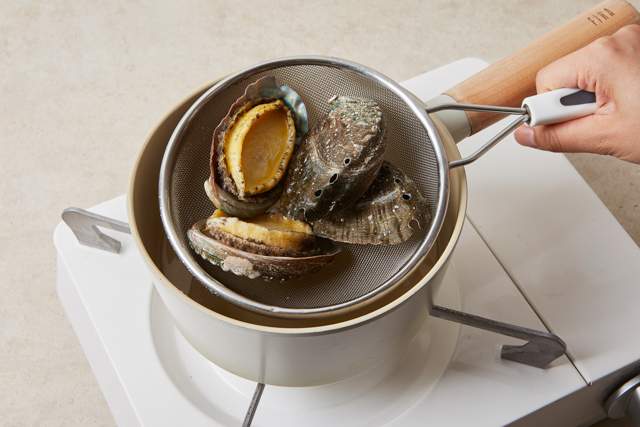 전복은 깨끗이 손질 후 끓는 물에 2~3분간 데쳐 준다.