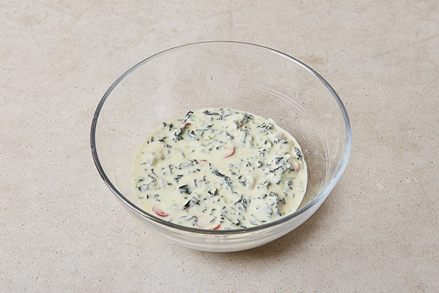 손질한 재료와 요즘미역을 부침가루에 넣어준 후 물을 고루 섞는다.