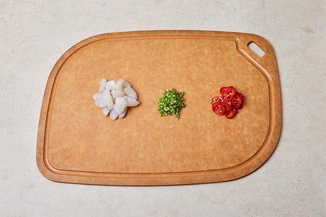 새우는 4등분, 청양고추는 잘게 다지고, 홍고추는 송송 썰어 준비한다.