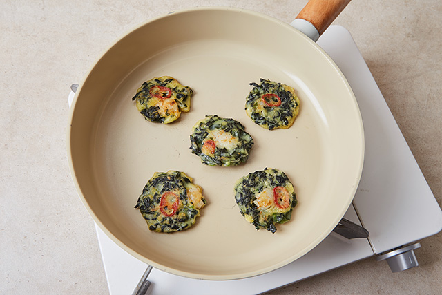 후라이팬에 카놀라유를 두르고 반죽을 작고 동그랗게 구워 완성한다.