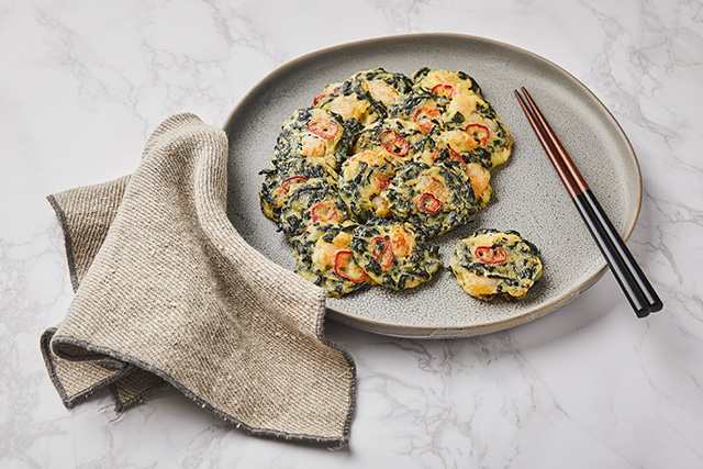 오뚜기 요즘미역 4.5G2봉(9g), 물160ml, 오뚜기 부침가루 100g, 청양고추 1개, 새우 7마리 120g, 홍고추1개, 오뚜기 프레스코 카놀라유 3T