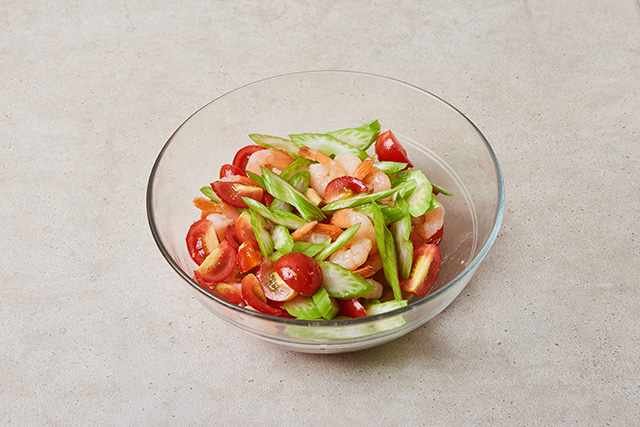 방울토마토2컵, 칵테일 새우2컵, 제주콩으로 만든 생낫또 2팩, 샐러리 1대, 소금0.3t, 간장1T, 식초 1.5T, 포도씨유1T, 올리고당1T, 연겨자0.5T