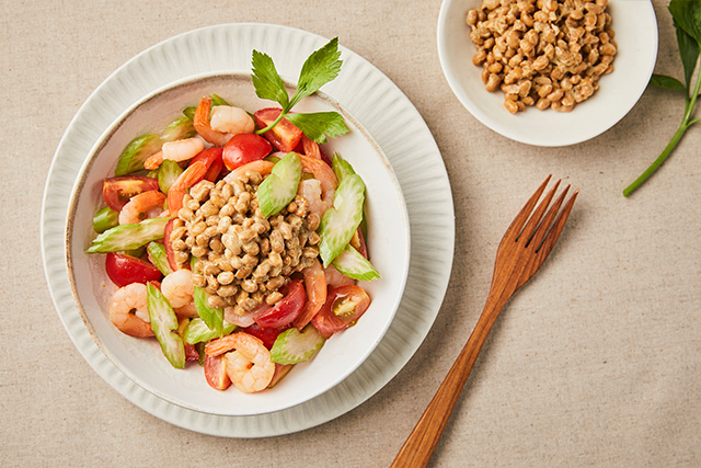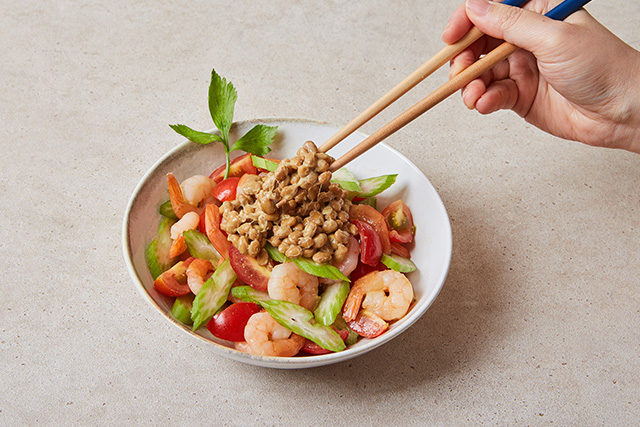 탱글탱글한 새우와 채소에 낫또가 어우러져 씹을수록 고소하고 든든한 샐러드 완성! 건강식품 낫또의 새로운 변신~ 맛있고 건강하게 드셔보세요!