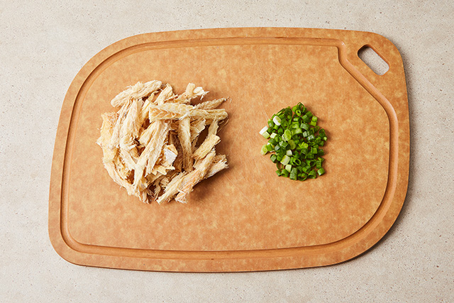 북어포는 지느러미와 가시, 불순물을 제거해 한 입 크기로 자르고 쪽파를 송송 썬다.