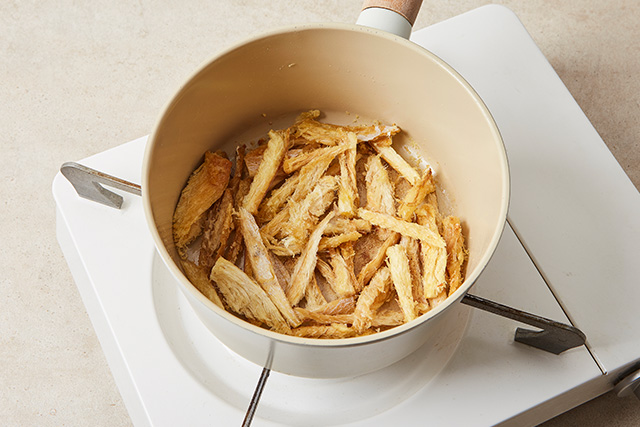 냄비에 들기름을 두르고 다진마늘을 볶다가 손질한 북어포와 미향을 더해 볶는다.
