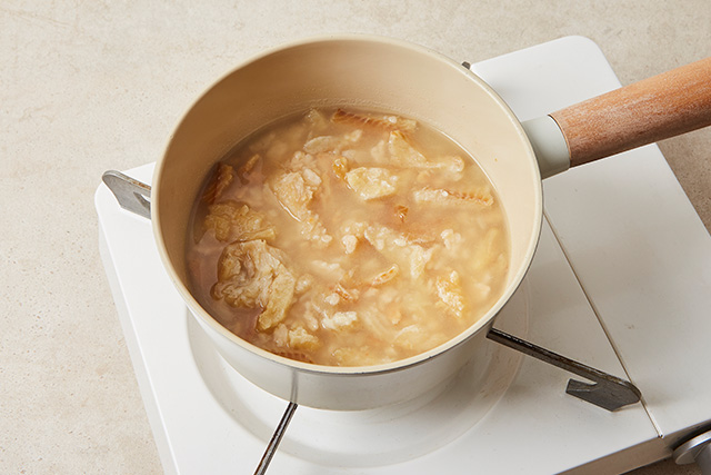 누룽지와 물, 멸치장국, 소금, 백후추를 더해 10분간 끓인다.
