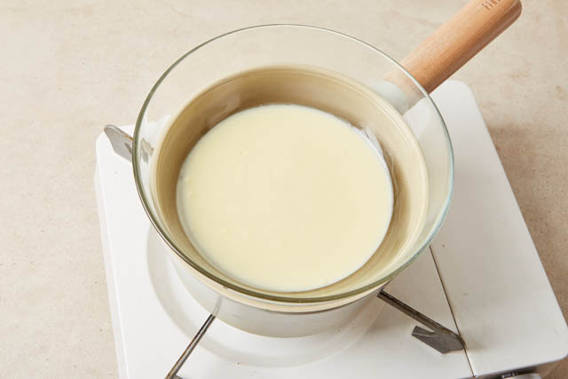 볼에 크림치즈와 설탕, 우유, 생크림을 담고 중탕해 녹인다.