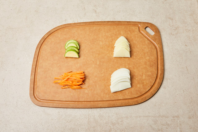 애호박과 감자는 반달모양으로 썰고 양파와 당근은 채 썬다.
