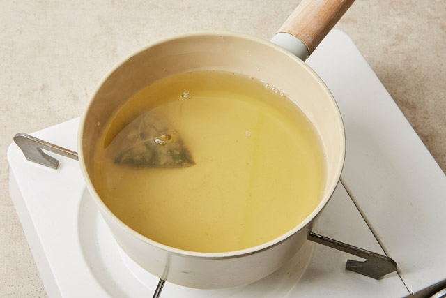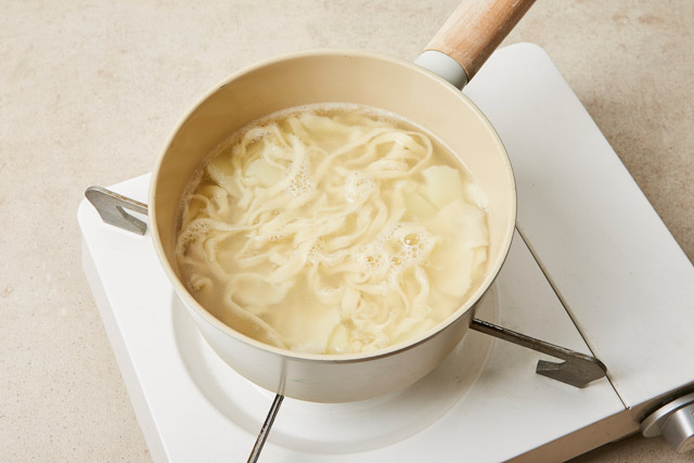 냄비에 육수용 물을 끓이고 감자수제비키트에 있는 육수티백을 넣어 4분간 끓인다.
