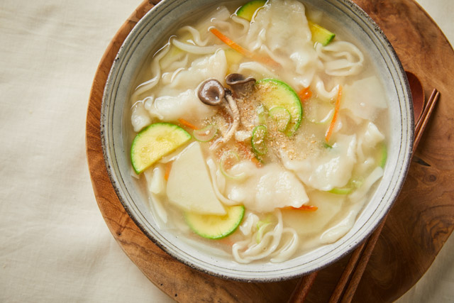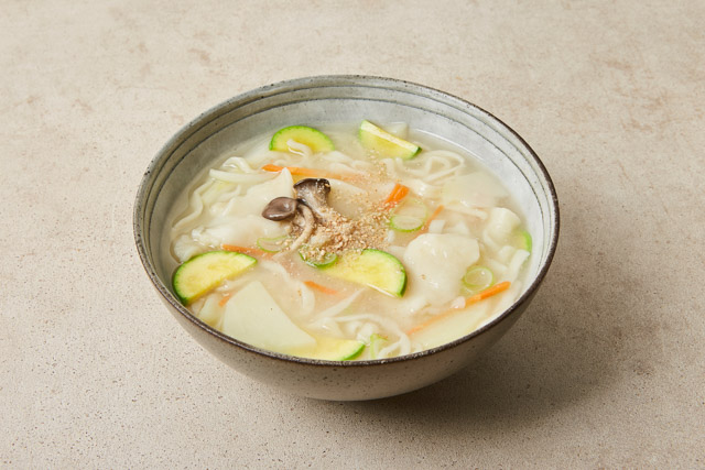육수티백을 건져낸 후 칼국수면과 수제비 반죽을 조금씩 떼어 넣고 3분간 끓인다.