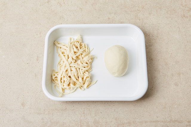 반죽믹스에 반죽용 물을 넣고 3분간 반죽한 후 밀대로 균일하고 얇게 밀어 반죽의 절반은 칼국수용으로 자르고 남은 절반은 수제비용으로 남긴다.