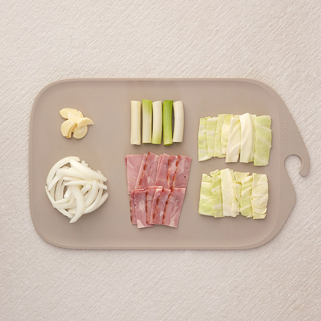 마늘과 양파는 슬라이스하고 대파와 베이컨, 양배추는 5cmX2cm로 자른다.