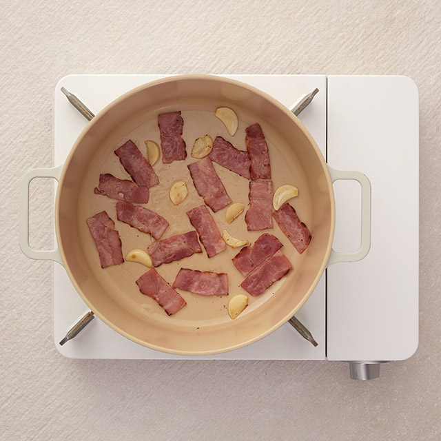냄비에 베이컨과 마늘을 넣고 마늘의 향이 올라올 때 까지 볶아준다.