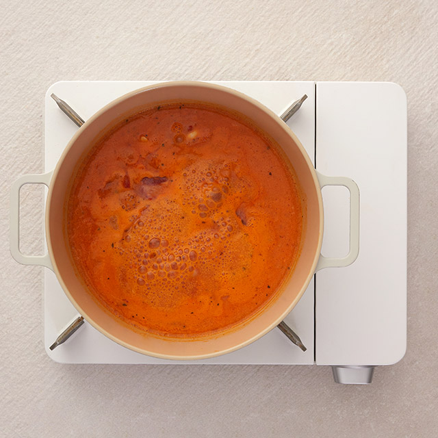 위의 냄비에 베이컨로제소스, 고추장, 우유, 물을 넣어 끓인다.