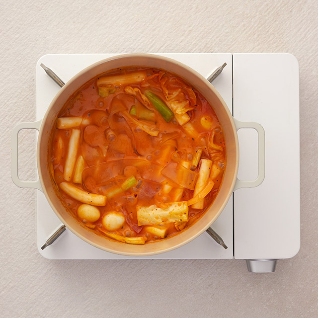소스가 팔팔 끓으면 쌀떡볶이떡, 야채(대파, 양파, 양배추), 메추리알을 넣고 5분간 끓인다.