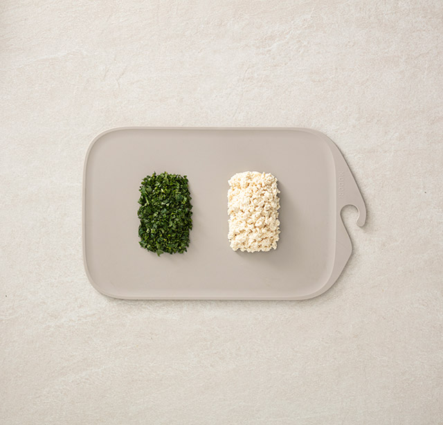 취나물은 잘게 다지고, 두부는 칼 옆면으로 으깬 후 면보를 사용해 물기를 짜낸다.