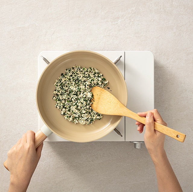 취나물 숨이 죽을 때쯤 두부를 넣고 볶아 수분을 날려준 후, 소금 간을 한다.