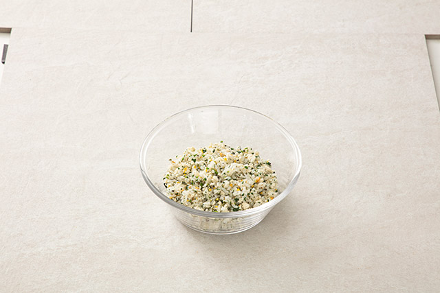 큰 볼에 4번과 밥, 초밥소스, 조미 볶음을 넣고 조미 양념을 해준다.