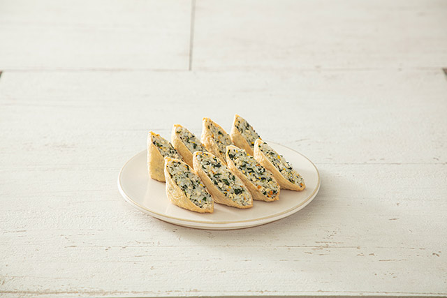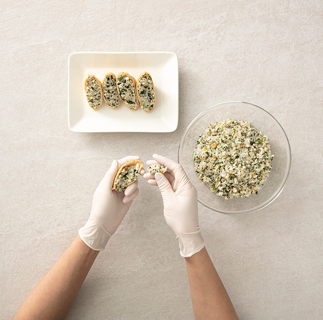 유부에 조미된 밥을 채워 넣어 유부초밥을 완성한다.