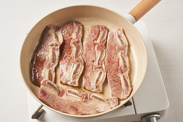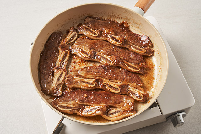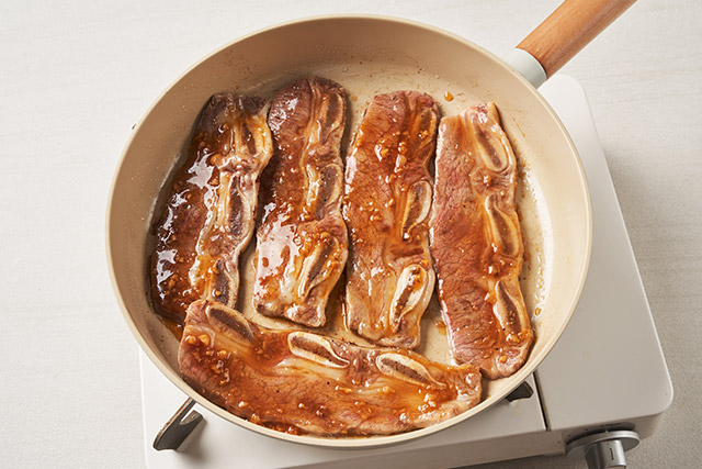 예열한 후라이팬에 LA갈비를 80%까지 굽는다.