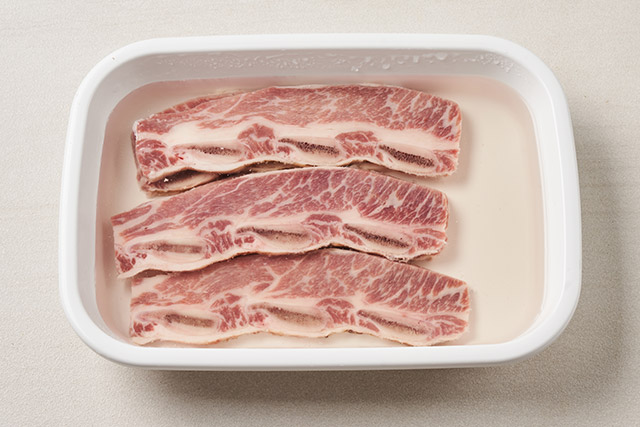 LA갈비가 잠길만큼 찬물을 부은 뒤 약 1시간 동안 2~3회 정도 물을 갈아주며 핏물을 뺀다.