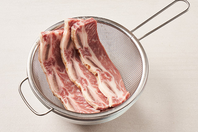 핏물을 빼준 후 물에 헹군 뒤 체에 밭쳐 물기를 완전히 제거한다.